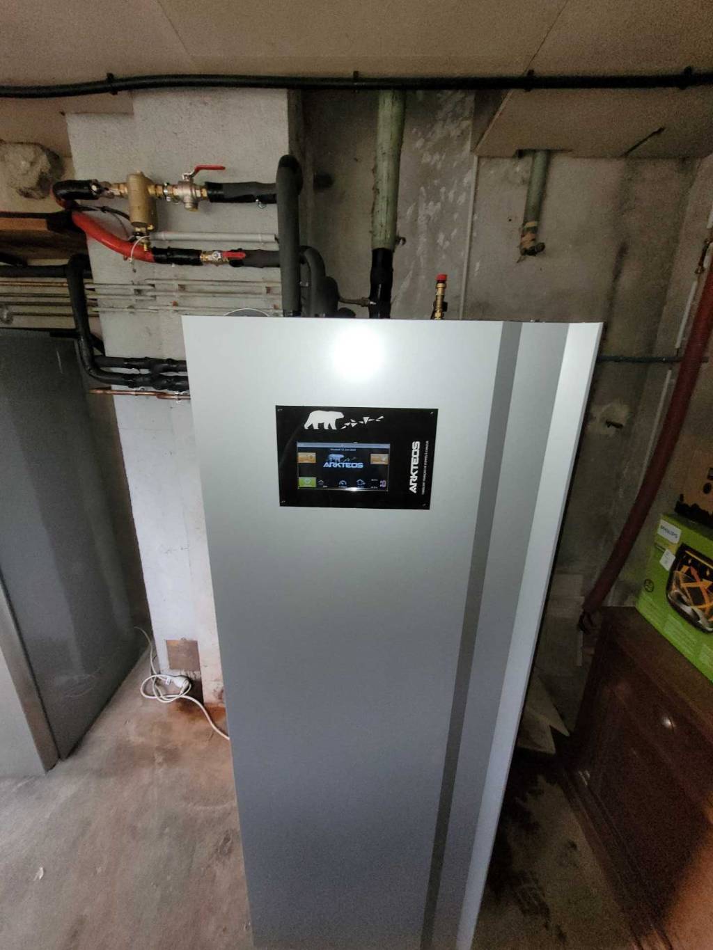 - Fourniture et installation d’une pompe à chaleur air/eau Arkteos Timax 3 085V Monobloc avec une résistance électrique d'appoint de 6 kW avec un groupe extérieur Mitsubishi