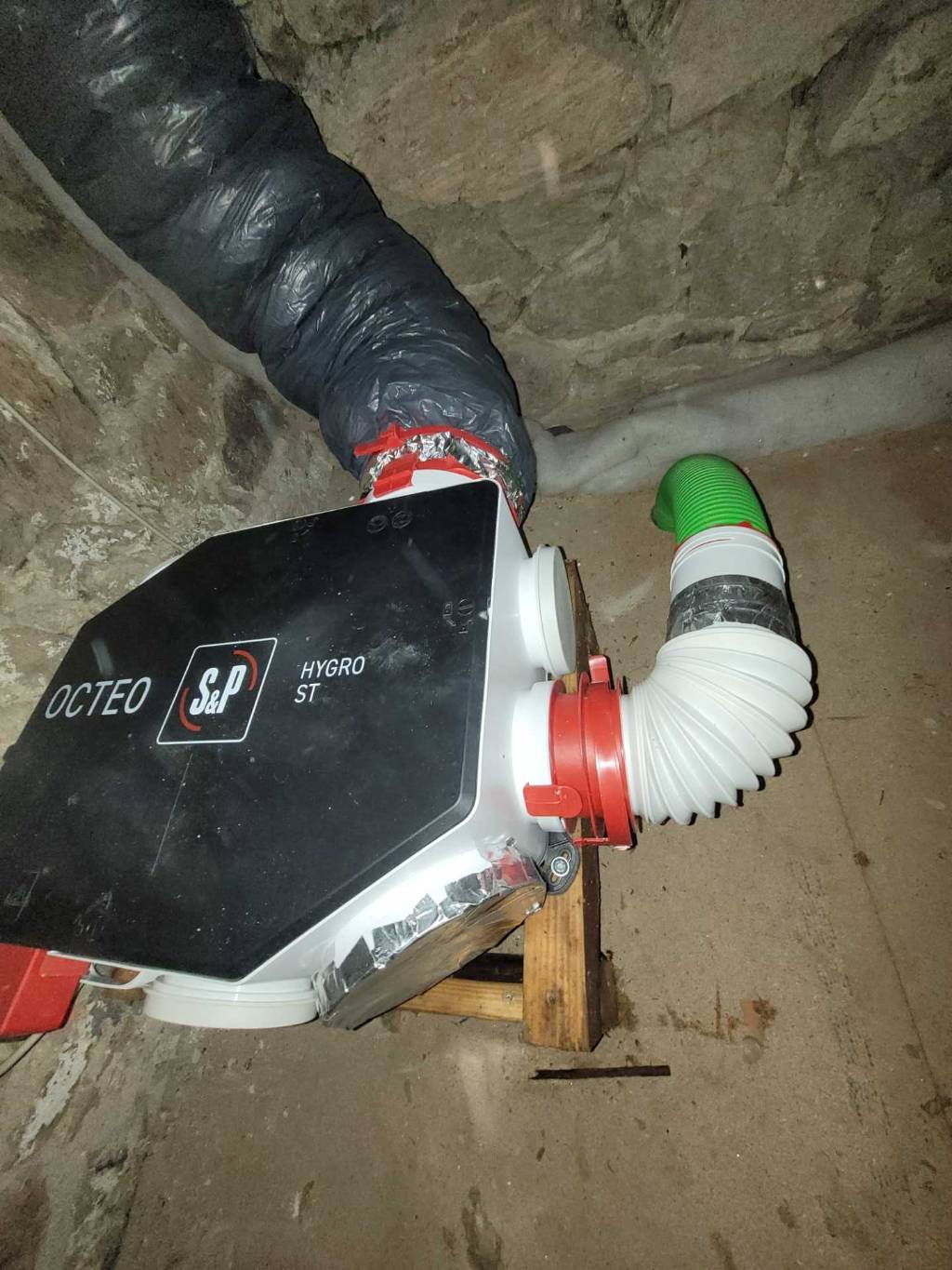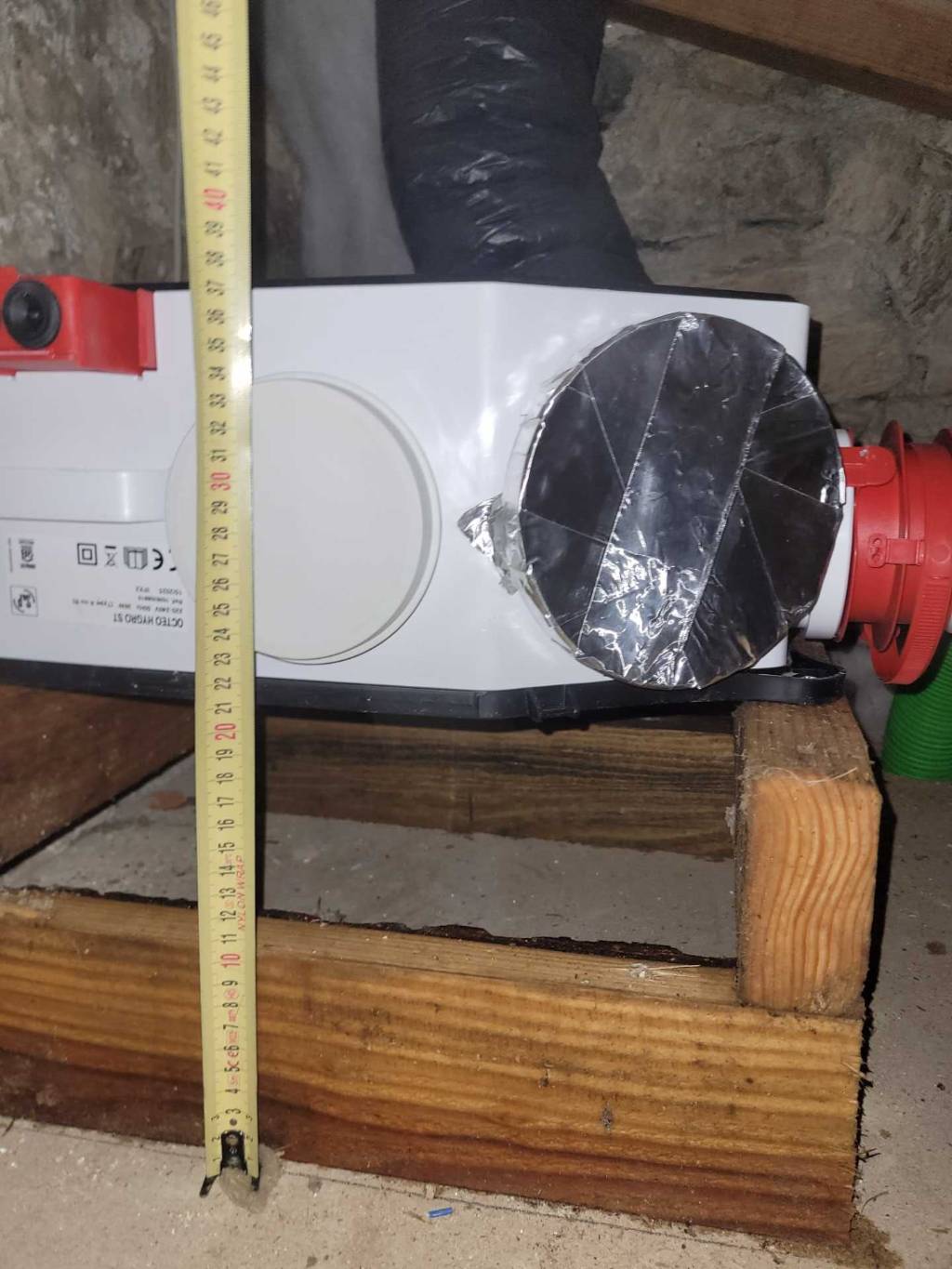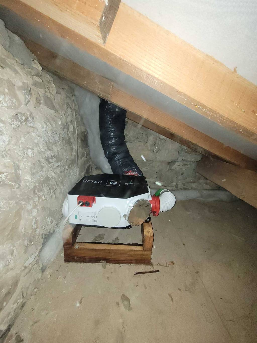 Nous avons donc installé un système de ventilation comprenant deux VMC simple flux Hygrovariable OCTEO Hygro ST situé dans les combles avec des bouches d'extractions réglementaires dans la cuisine, dans les salle de bain (2), et dans les WC (1).